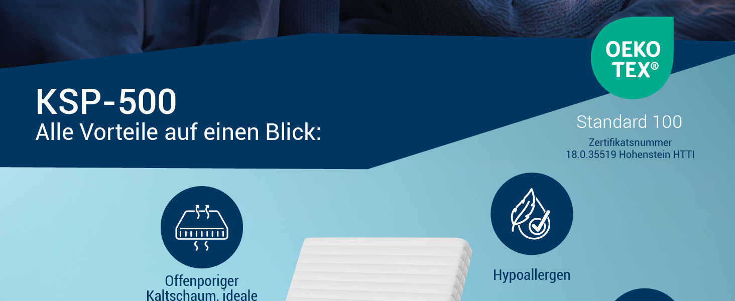 Unsere Matratze ist hypoallergen und antibakteriell und eignet sich hervorragend für Allergiker. Zudem ist sie schadstoffgeprüft nach STANDARD 100 by OEKO-TEX Produktklasse 1, was Sicherheit und Qualität für die ganze Familie gewährleistet. Die Zertifikatsnummer 18.0.35519 Hohenstein HTTI gibt Ihnen zusätzliche Sicherheit bei Ihrem Kauf.