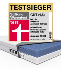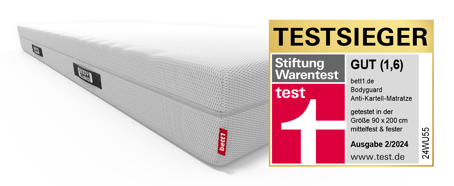 Die BODYGUARD Anti-Kartell-Matratze wurde von der Stiftung Warentest mit der Note 1,6 (Test 2/2024) ausgezeichnet. Erhältlich in den Größen 90×200 cm, bietet sie sowohl mittel-feste als auch feste Varianten und garantiert Ihnen höchsten Schlafkomfort.