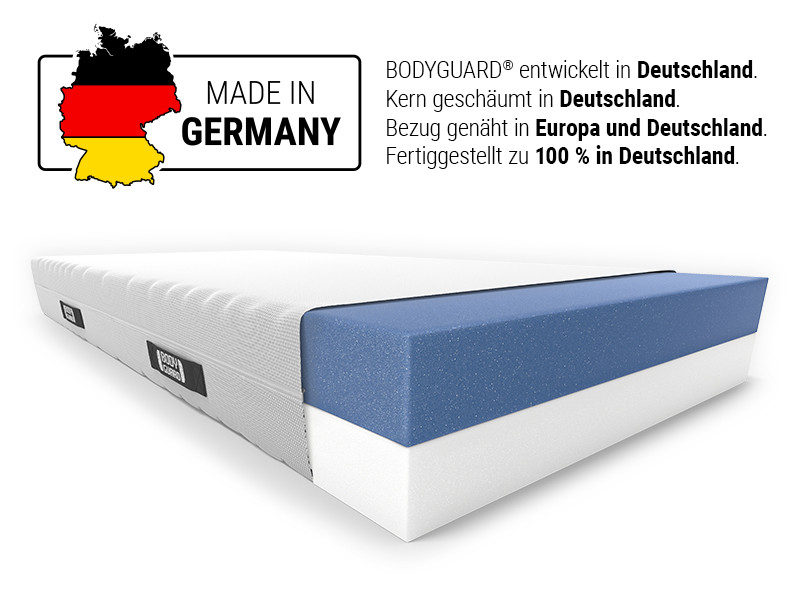 BODYGUARD steht für Qualität made in Germany. Vom Kern, der in Deutschland geschäumt wird, bis hin zum Bezug, der in Europa und Deutschland genäht wird, können Sie sich auf höchste Verarbeitungsstandards verlassen. Unsere Matratze ist nicht nur die meistverkaufte in Deutschland, sondern auch ein Zeichen für Qualität und Vertrauen.