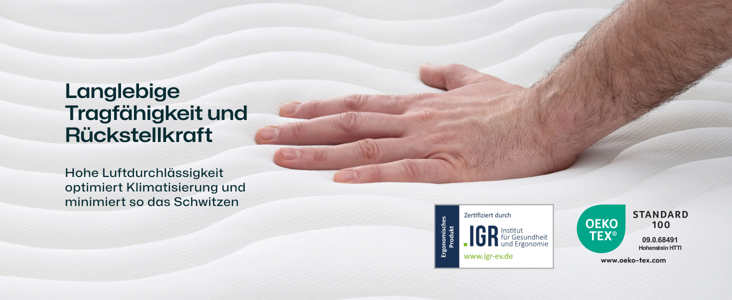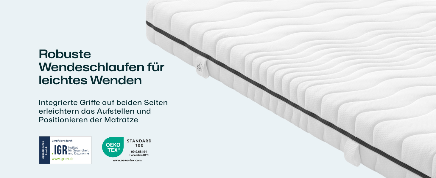 Die Matratze ist ideal für Hausstaubmilben-Allergiker geeignet. Der hautfreundliche Bezug aus 100% Polyester gewährleistet nicht nur eine angenehme Schlafumgebung, sondern ist auch schadstoffgeprüft und nach OEKO-TEX STANDARD 100 Klasse 1 zertifiziert. Dies bedeutet, dass er auch für die empfindlichste Haut von Babys geeignet ist.