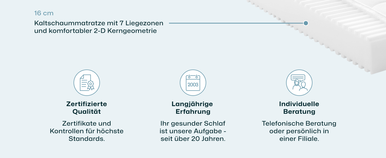 Die Matratze hat eine Kernhöhe von 14 cm und eine Gesamthöhe von 16 cm, mit einem Härtegrad von H1/H2, was ideal für Körpergewichte bis zu 65 kg ist. Das 2D-Körperzonenprofil ermöglicht eine gezielte Entlastung in der Schulter- und Beckenbereich, was den Schlafkomfort erheblich steigert.