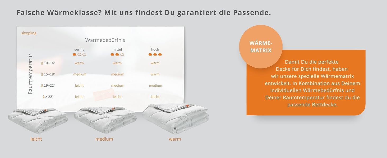 Die vier Jahreszeiten Bettdecke besteht aus einer leichten und einer mittleren Decke, die durch 8 Druckknöpfe einfach zusammengeschnallt werden können, um eine warme, kuschelige Decke für die kalten Monate zu schaffen. Sollte die Wärmeklasse nicht Ihren Erwartungen entsprechen, können Sie die Decke problemlos und kostenfrei zurückschicken oder umtauschen.