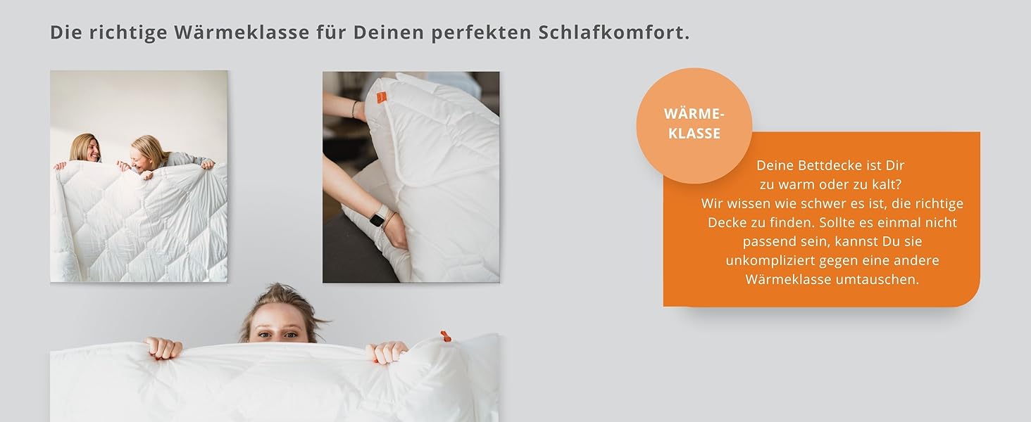 Die ganzjährige Bettdecke erfüllt die Bedürfnisse von Schläfern mit normalem Wärmebedarf und ist ideal für die Übergangszeit. Sollte die Wärmeklasse nicht Ihren Erwartungen entsprechen, bieten wir Ihnen die Möglichkeit, die Decke kostenlos zurückzusenden oder umzutauschen.