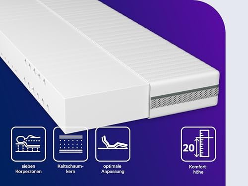 Unsere 7-Zonen Kaltschaummatratze bietet Ihnen die Flexibilität von zwei Härtegraden: H2 (weich) und H3 (mittelfest). Durch einfaches Wenden der Matratze ermöglicht es Ihnen, die Liegehärte nach Ihren individuellen Bedürfnissen anzupassen. Mit einer Kernhöhe von ca. 19 cm und einer Gesamthöhe von ca. 20 cm ist die Matratze perfekt auf die Anforderungen an einen gesunden Schlaf ausgelegt.