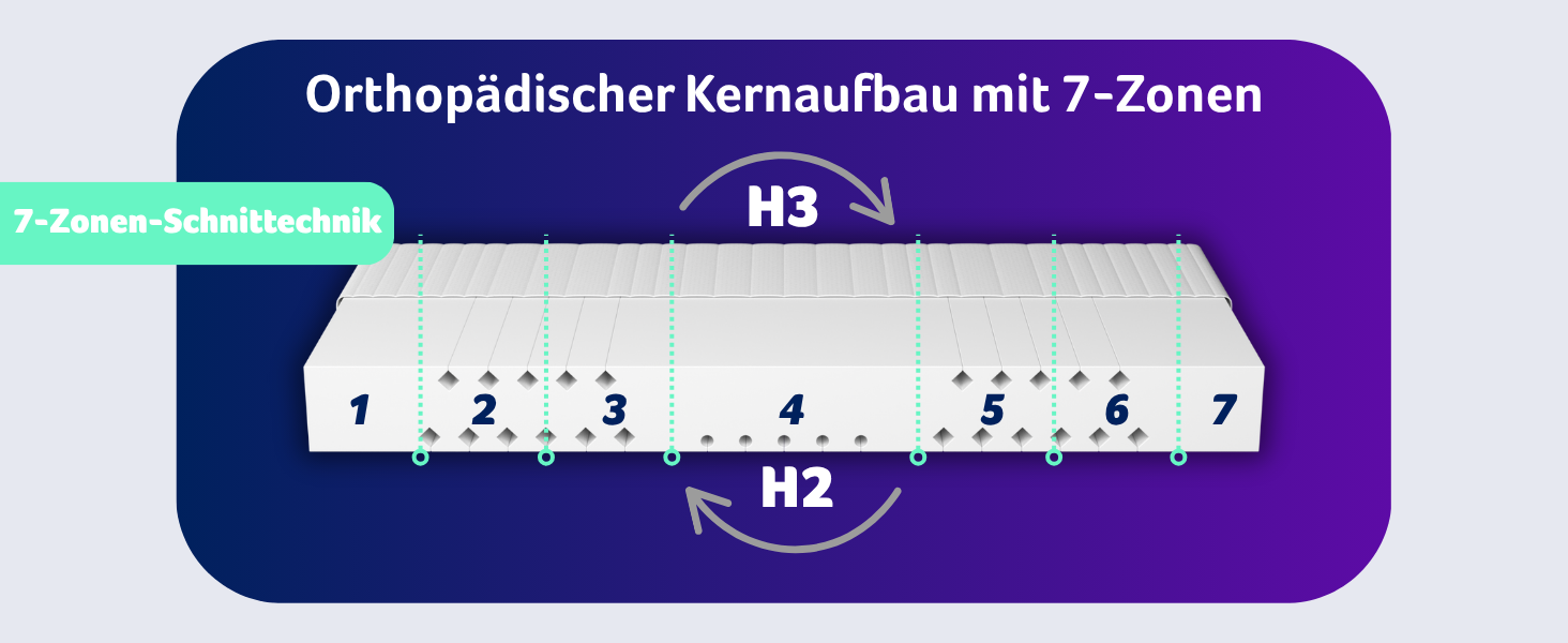 Erleben Sie den perfekten Schlaf mit unserer orthopädischen 7-Zonen Kaltschaummatratze. Der innovative Duo Härtegrad (H2 & H3) sorgt für eine hervorragende Unterstützung besonders im Lendenbereich, während der Schulter- und Hüftbereich sanft einsinkt. Diese Matratze ermöglicht somit eine optimale Druckentlastung, die Ihren Schlaf revolutioniert.