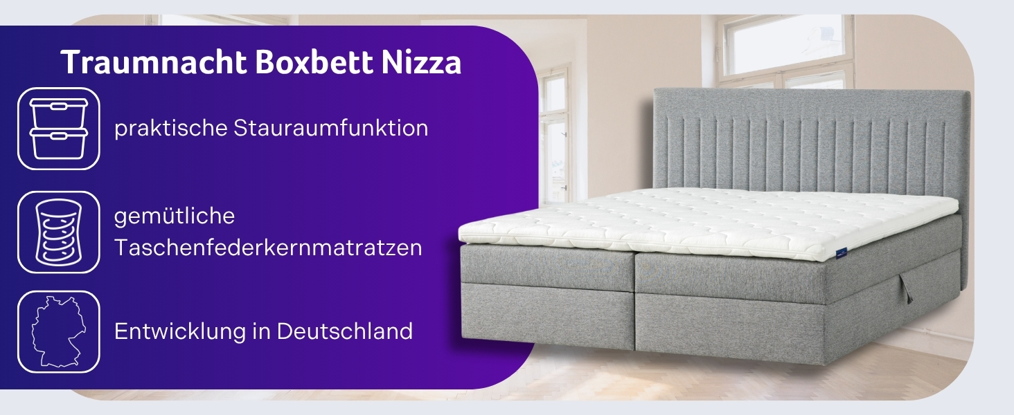 Das Traumnacht Boxbett Nizza überzeugt durch seinen bodentiefen Bettkasten, der nicht nur elegant aussieht, sondern auch als praktischer Stauraum dient. Der Bezug aus kuscheligem, glatten Webstoff mit feiner Struktur verleiht dem Bett nicht nur einen luxuriösen Look, sondern sorgt auch für eine angenehme Haptik. Die hochwertige Verarbeitung und die Liebe zum Detail machen dieses Bett zu einem Schmuckstück in Ihrem Schlafzimmer.